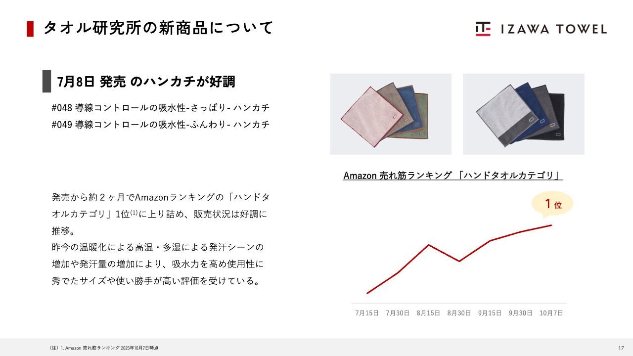 日本の「タオル研究所」については、新商品のハンカチが発売から約2ヶ月でAmazonランキングのハンドタオルカテゴリで1位に上り、販売状況は好調に推移しています。
