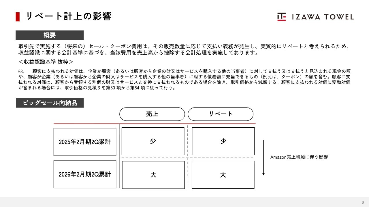 リベート計上の影響についてです。概要としては、取引先で実施する将来を含めたセールやクーポンの費用については、その販売数量に応じて支払い義務が発生し、実質的にリベートと見なされます。このため、収益認識に関する会計基準に基づき、これらの費用を売上高から控除する会計処理を行っています。