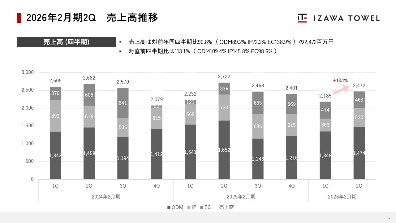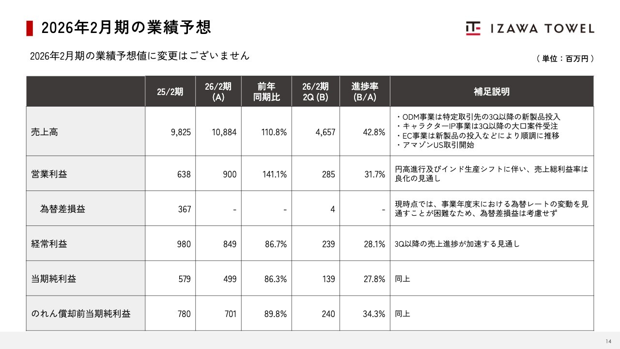 三好拓人氏:これより、伊澤タオル株式会社2026年2月期第2四半期決算説明会を開催します。取締役CFOの三好拓人です。本日はご多忙の中、決算動画をご視聴いただき、誠にありがとうございます。それではさっそく第2四半期の業績についてご説明します。