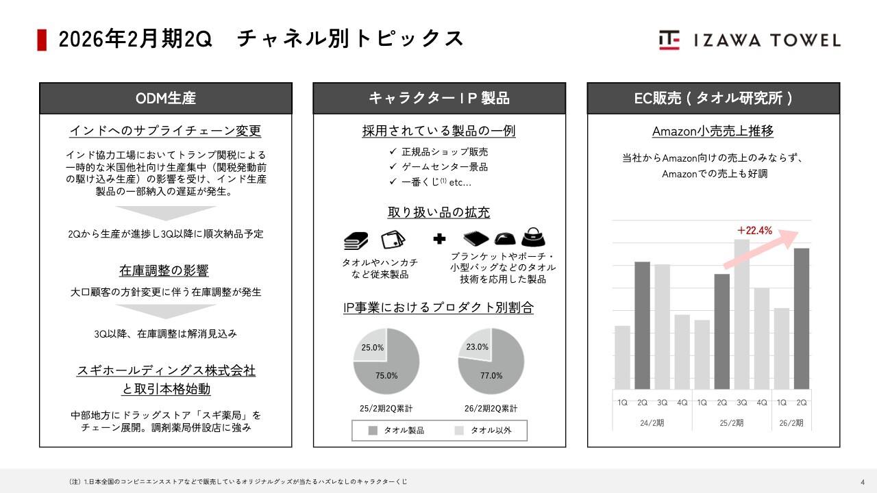 販売チャネル別のトピックについてです。ODM生産事業においては、インドへのサプライチェーン移行に課題があります。第1四半期には、インドの協力工場でトランプ関税の影響による一時的な米国他社向け生産集中の影響が発生しましたが、第2四半期から生産が進捗し、第3四半期以降に順次取引先への納品が予定されています。また、第2四半期には大口顧客の方針変更により在庫調整が発生しましたが、第3四半期以降には解消が見込まれます。