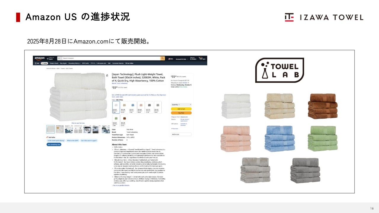 「Amazon US」の進捗状況についてご説明します。2025年8月に発売を開始しました。新しいシリーズも順次投入していく予定です。
