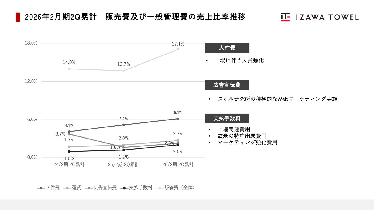 販売費および一般管理費の売上比率推移です。第2四半期累計の売上比率は17.1パーセントで、前年同期比で3.4ポイント増加しました。増加の要因としては、上場に伴う管理部門の強化、上場関連費用の一時的な発生、「タオル研究所」による積極的なWebマーケティングの実施、また欧米での特許出願費用の増加が挙げられます。