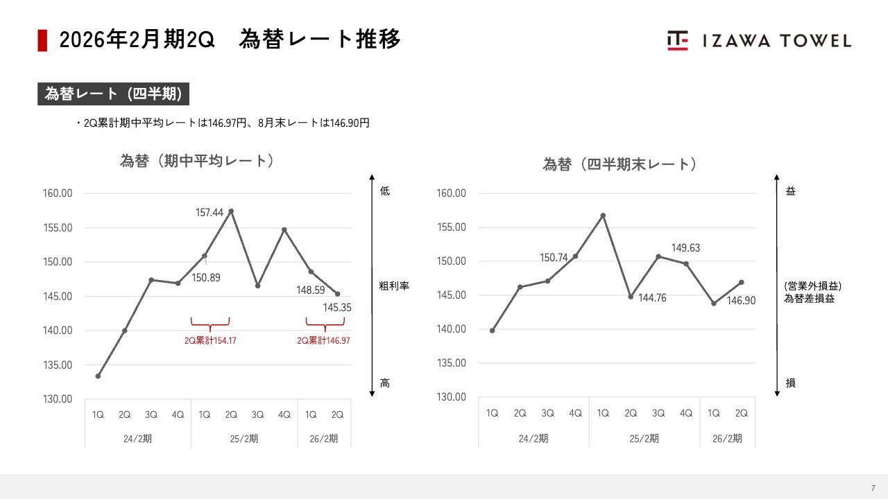 為替レートの推移についてです。第2四半期累計の期中平均レートは146.97円で、前年同期より約7円の円高となっています。第2四半期末のレートは146.90円で、前年同期末と比べ約2円の円安に進みました。