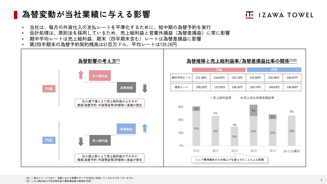 為替変動が当社業績に与える影響についてご説明します。当社は海外から製品を輸入しているため、為替の影響を受けています。この影響を平準化するため、短期・中期の為替予約を活用し、ヘッジを実施しています。これにより、当社は円高にも円安にも強い企業体質を有しています。