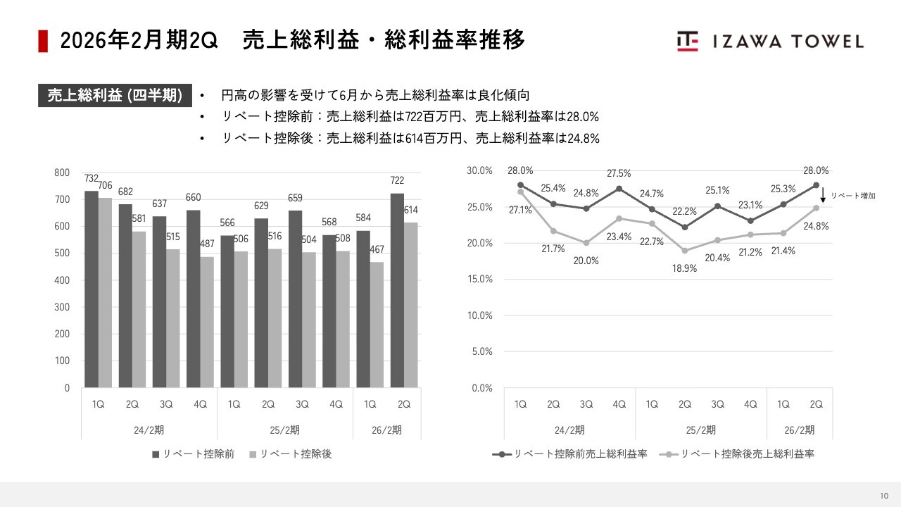 売上総利益および売上総利益率の推移についてです。リベート控除前の売上総利益は7億2,200万円で、売上総利益率は28.0パーセントです。一方、リベート控除後の会計上の売上総利益は6億1,400万円で、売上総利益率は24.8パーセントとなっています。