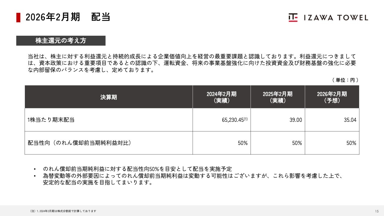 株主還元の考え方についてです。当社は株主のみなさまへの利益還元を資本政策の重要項目として認識しています。上場後の配当方針については、上場前と同様に、のれん償却前当期純利益の50パーセントを継続していく方針です。なお、為替変動などの外部要因によって利益が変動する場合は、これらの影響を考慮し安定的に配当を目指していきます。