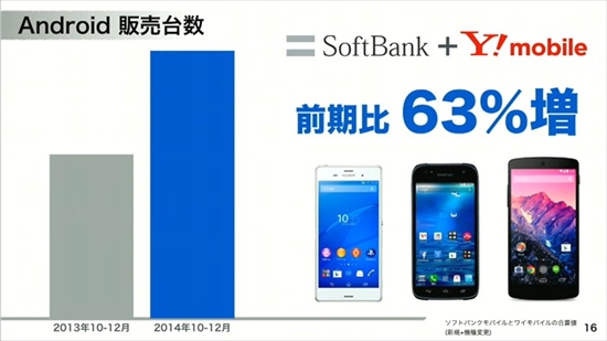 またソフトバンクといえばiPhone一辺倒というふうに思われがちですけれども、Androidにおきましても前年対比でなんと63%伸びていると。ソフトバンクと、またソフトバンクの100%子会社でありますワイモバイルを足した数量において、前年対比63%(の伸び)。
