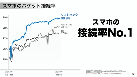 今においては、ソフトバンクのモバイルだからつながらないという話は、だいぶ過去のものになってまいりました。実際にいろんな調査結果がありますけれども、我々のネットワークの接続率、どこでつながるかというような調査の結果は、他社を大きく、コンスタントに上回るという状況がでております。