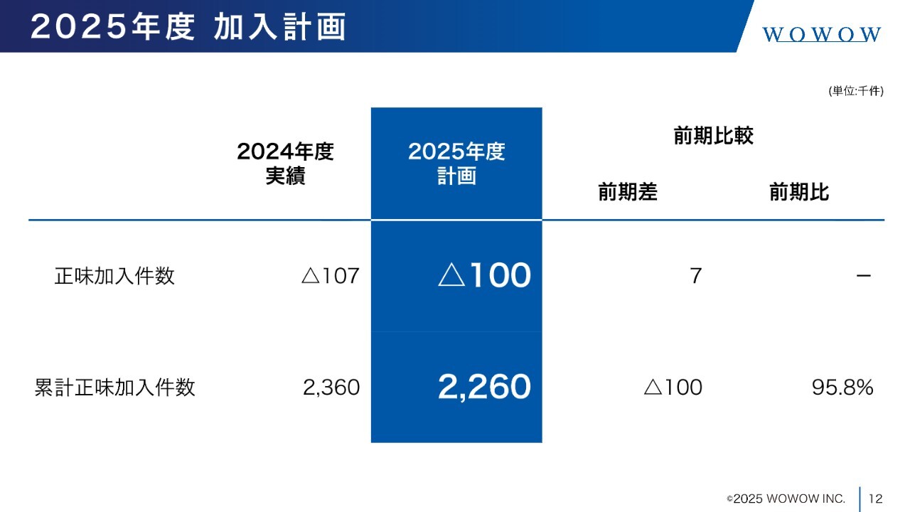 スライド12ページ、2025年度加入計画です。加入計画は、正味加入件数マイナス10万件、累計正味加入件数226万件と、こちらも5月の公表値から変更はありません。