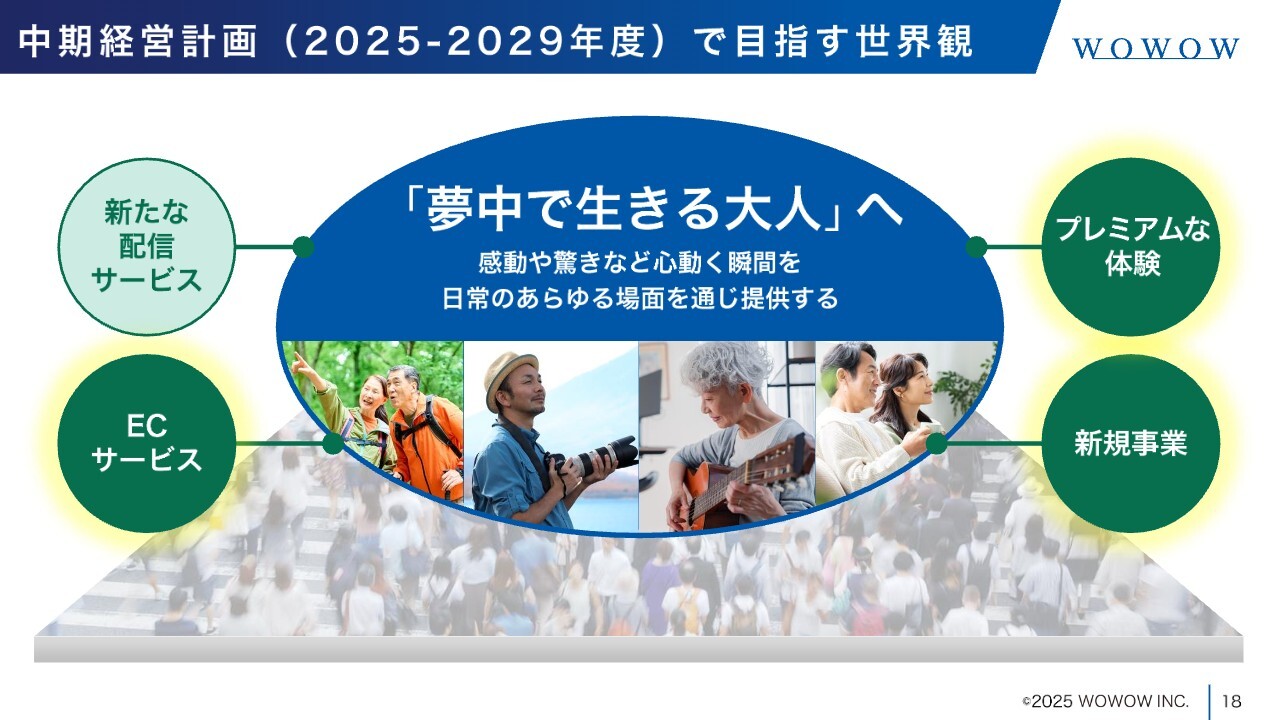 スライド18ページです。ご覧のとおり、今年5月に発表した中期経営計画では、夢中で生きる大人に向けて、さまざまな事業を展開していきます。