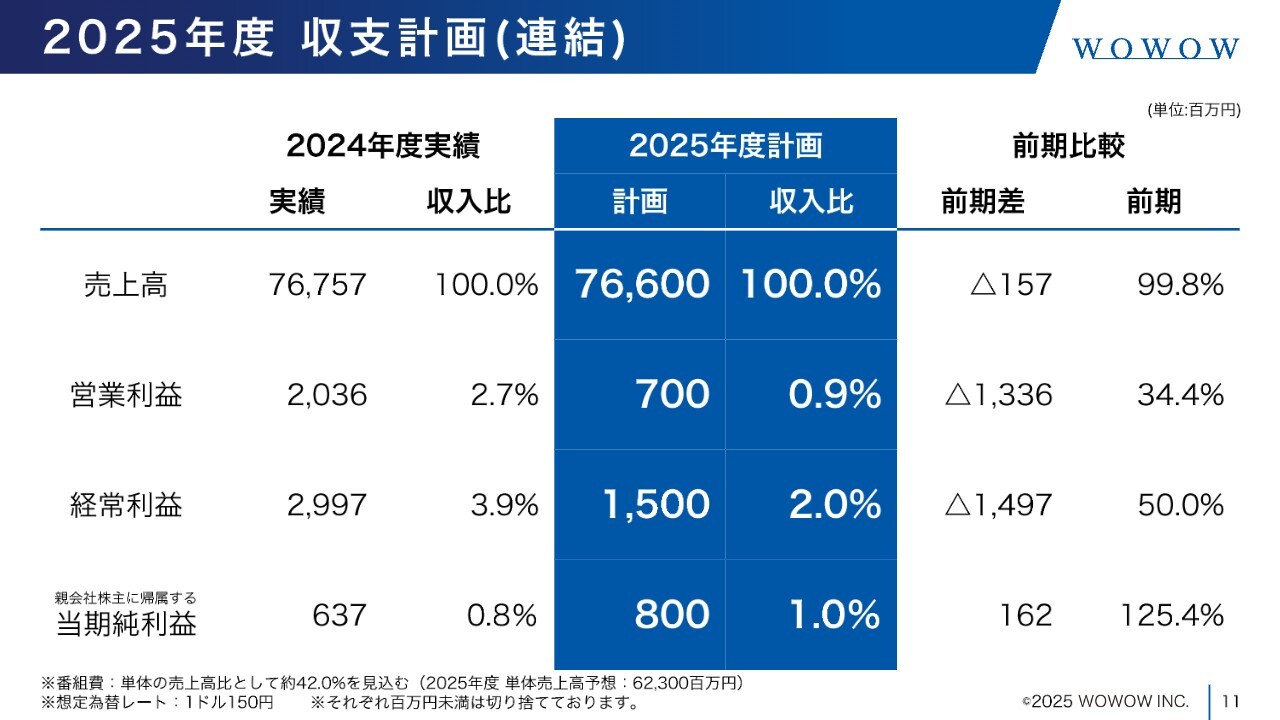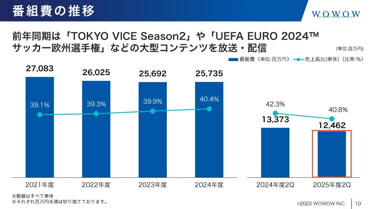 スライド10ページ、番組費の推移です。音楽コンテンツの放送・配信を強化しましたが、前年同期には「TOKYO VICE Season2」や「UEFA EURO 2024 サッカー欧州選手権」などの、大型コンテンツの放送・配信があったことなどにより、番組費は前年同期と比べ、9億1,100万円減少しています。