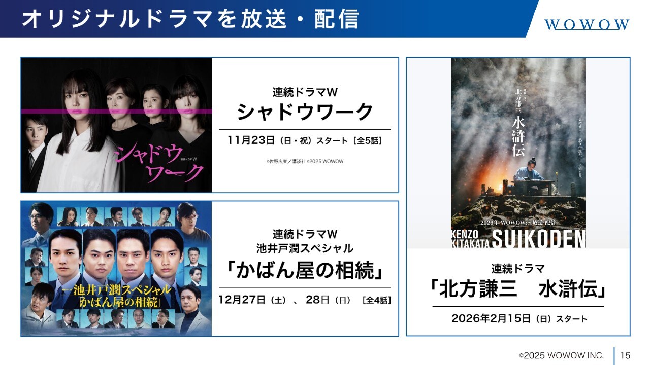 また、2026年2月15日放送・配信の、当社のフラッグシップコンテンツとなる連続ドラマ「北方謙三 水滸伝」も、着々と準備が進んでいます。主演の織田裕二や反町隆史、亀梨和也など、豪華キャストの本編映像を使用した特報が大きな反響を呼んだほか、楊志役を満島真之介、済仁美役を波瑠が演じることを先日発表し、話題となりました。今後も、続々と情報を発表していく予定ですので、ぜひご期待ください。