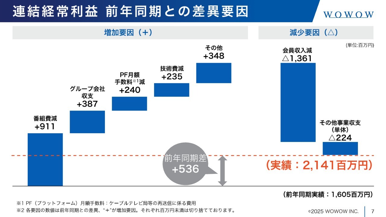 売上高は、会員収入が減少したものの、会員収入以外のその他収入やグループ会社の売上が増加したことなどにより、増収となりました。経常利益は、売上の増加に加え、番組費の減少や4K終了に伴う関連費用の減少などにより、増益となりました。