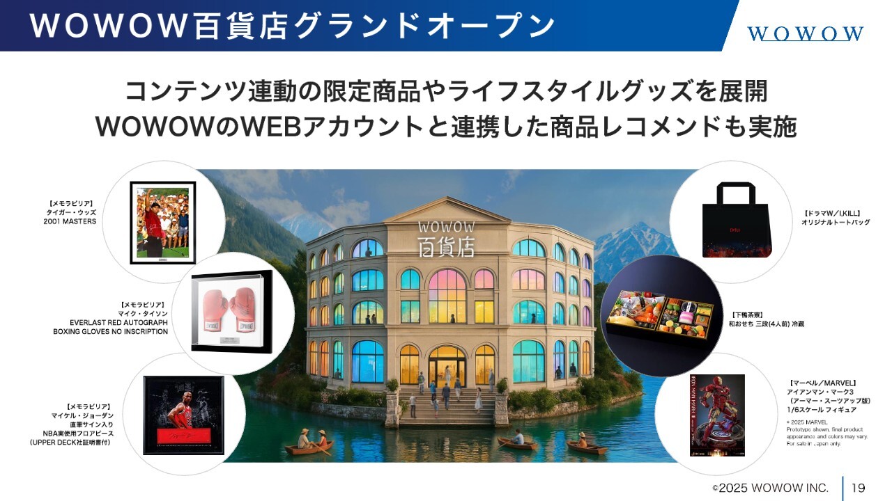 スライド19ページです。新しいECサービス、WOWOW百貨店についてです。今月15日に、WOWOW百貨店がグランドオープンしました。「人生を楽しむ大人のための百貨店」をストアコンセプトに掲げ、当社が放送・配信するコンテンツに連動した限定商品はもちろん、生活に彩りを添えるライフスタイルグッズを多数、取り揃えています。