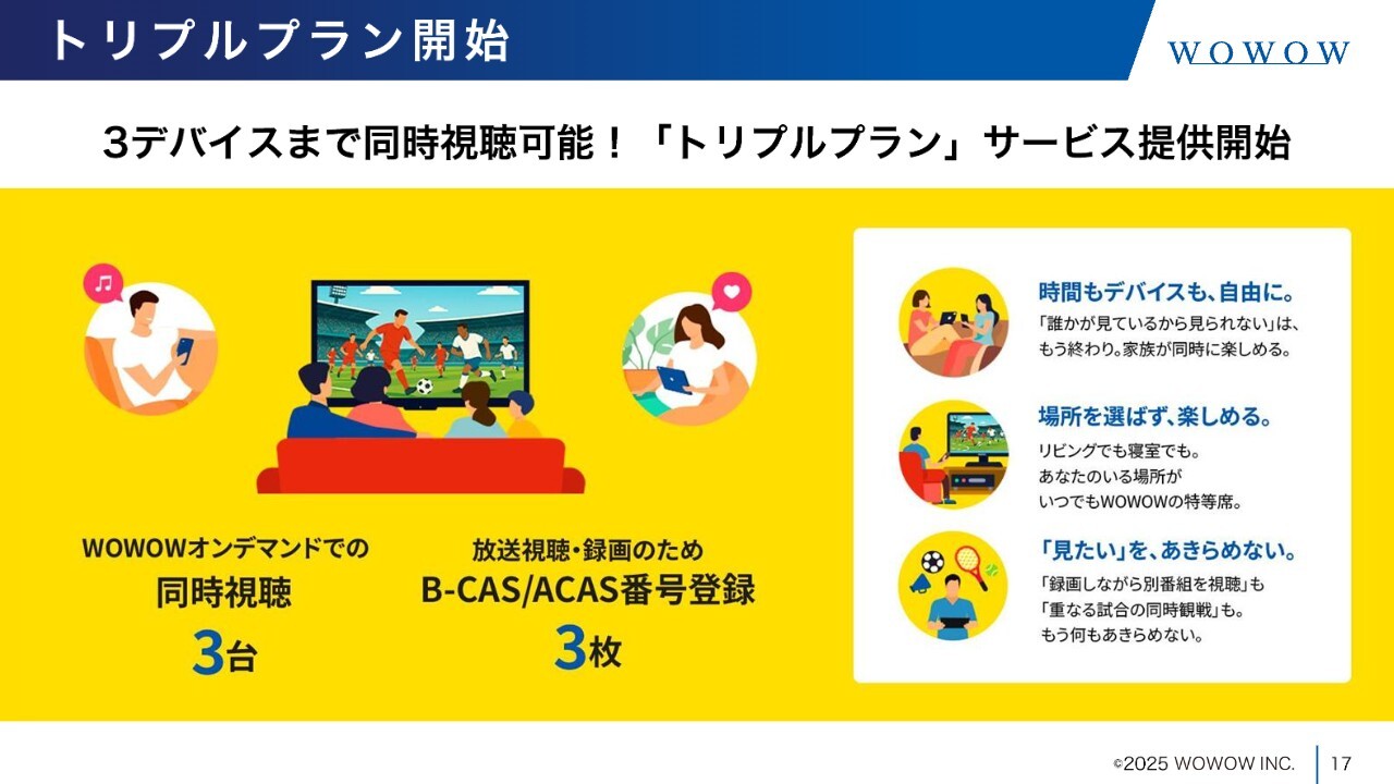 スライド17ページ、トリプルプランについてです。既存事業であるメディアサービスの利便性向上を目指し、10月より最大3台のデバイスで同時にコンテンツを視聴できるお得な新しい料金プラン「トリプルプラン」の提供を開始しました。