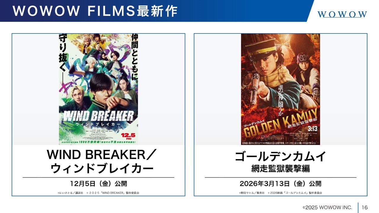 スライド16ページです。放送・配信サービス以外における収益向上を目指し、当社の劇場用映画レーベル「WOWOW FILMS」での映画制作も進んでいます。