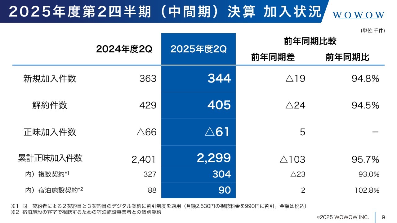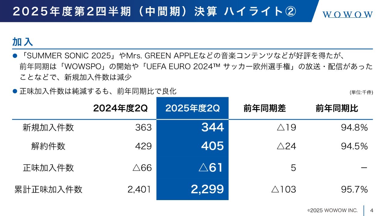 スライド4ページ、加入のハイライトです。2025年度第2四半期における、新規加入件数は34万4,000件、解約件数は40万5,000件となりました。音楽コンテンツなどが好評を得て、新規加入獲得に繋がったものの、前年同期は「WOWSPO」の開始や「UEFA EURO 2024 サッカー欧州選手権」の放送・配信といった、好影響を与える要因もあり、新規加入件数は減少しました。