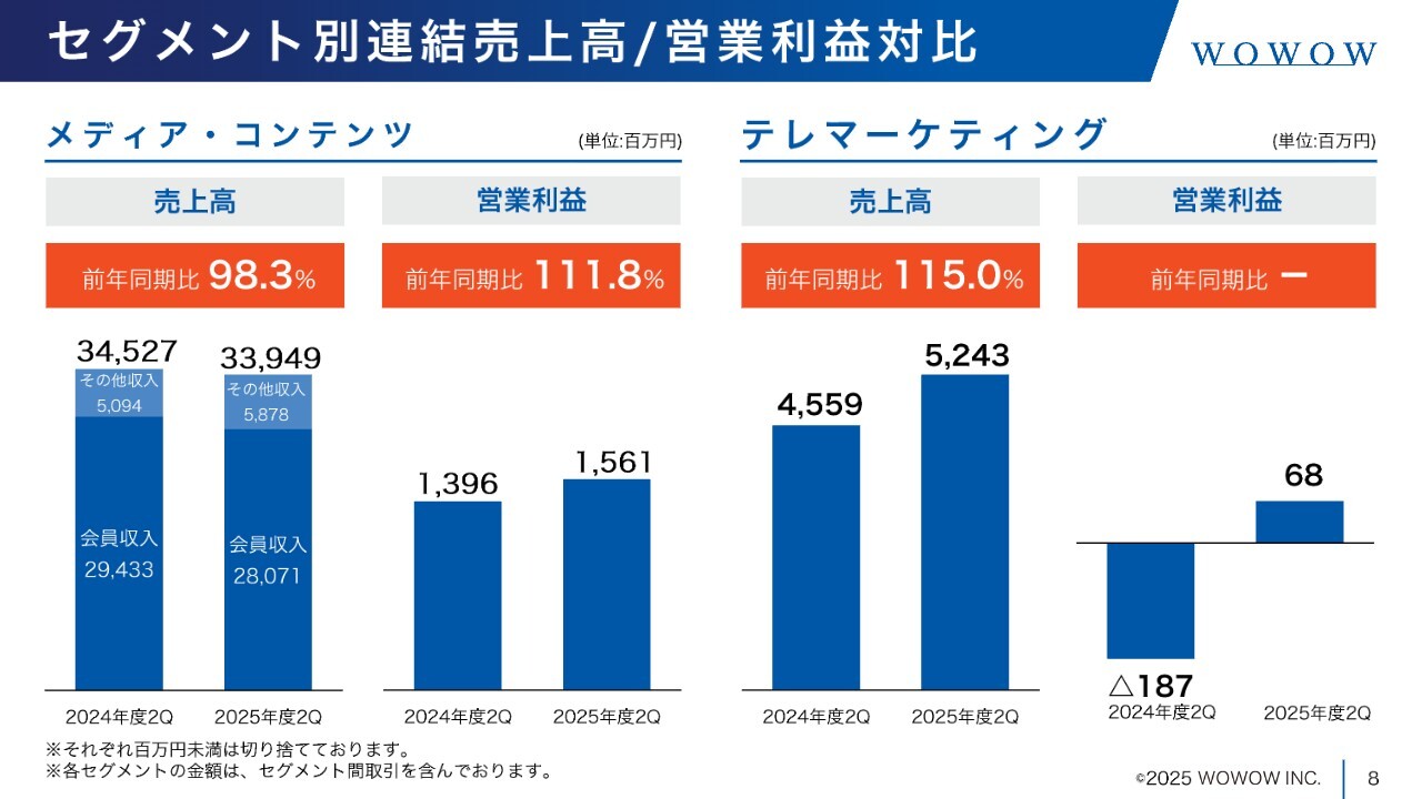 次に、テレマーケティングセグメントです。WOWOWコミュニケーションズにおける事業となります。売上高は、テレマーケティング業務の売上増や、CINRA社の売上が加わったことなどにより、6億8,300万円の増収となりました。