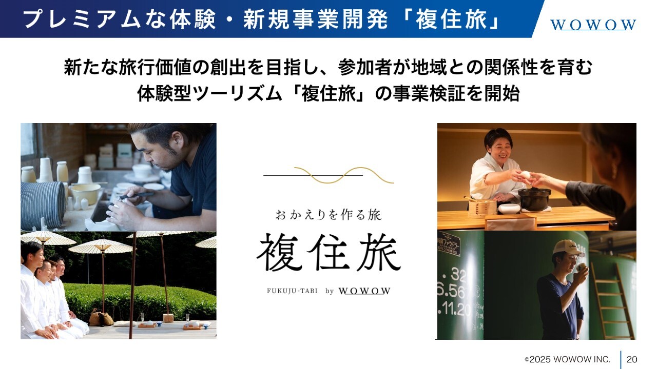 スライド20ページ、複住旅についてです。新規事業開発とプレミアムな体験を提供するサービスとして、新たな旅行価値の創出を目指し、参加者が地域との関係性を育む体験型ツーリズム、複住旅に関する事業検証を、10月より開始しました。