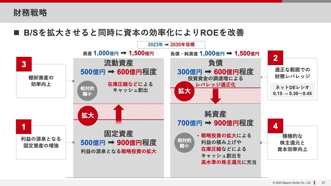そのための財務戦略としては、450億円から500億円の固定資産を増やしていきます。当社は今、DEレシオが非常に低い会社ですので、私どもの財務レバレッジを適正化していくことも含めて、バランスシートを改革していきます。