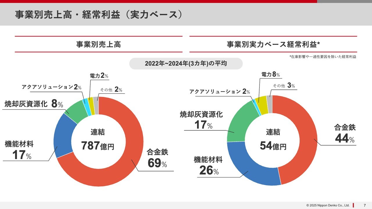 事業別売上高・経常利益です。私どものメインビジネスは合金鉄事業です。スライドのグラフをご覧のとおり、過去3年間の平均で売上高では約7割、利益では半分弱が合金鉄事業となっています。