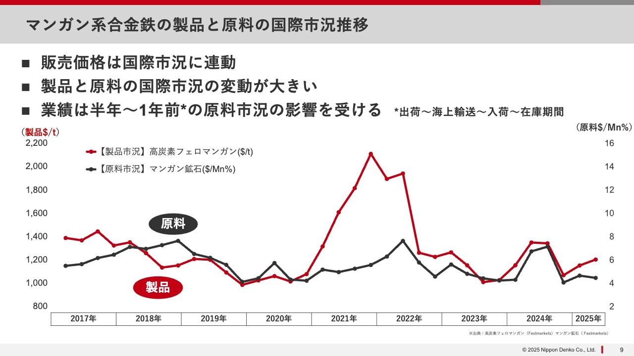 私どもは、合金鉄をすべて市況連動で売っています。つまり、国際市況に連動しており、赤の折れ線グラフが私どもの売値だと考えていただければと思います。