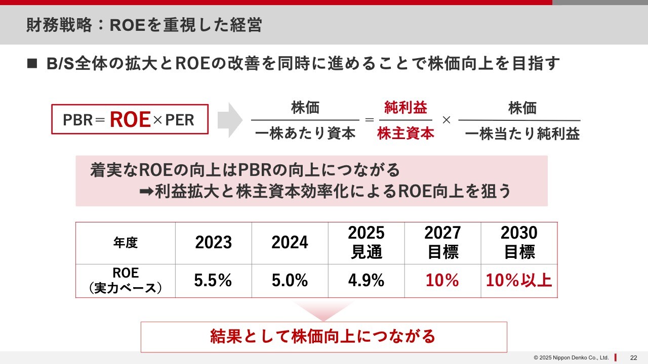 株価に対する1株当たりの資本であるPBRをブレイクダウンしていくと、ROEとPERの掛け算になります。PERは期待値であるため、私どもではコントロールできません。そのため、ROEの改善、すなわち利益を増やして株主資本を効率化させることに尽きると思っています。これにしっかり取り組んでいく方針です。