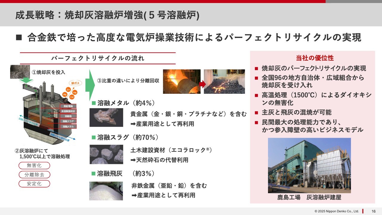 その上で、機能材料事業や焼却灰資源化事業など、合金鉄事業以外の事業を強化していくことを次の成長戦略として掲げています。