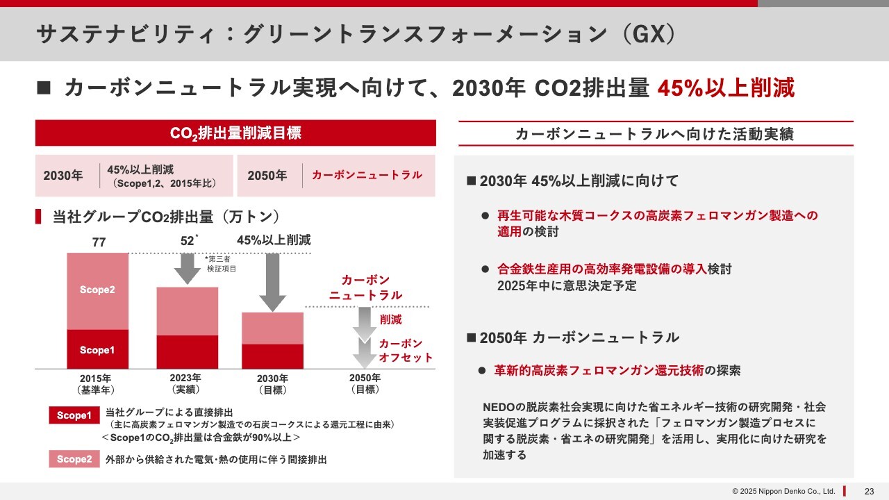 サステナビリティについてです。合金鉄製造時に排出される大量のCO2についても着実に減らしていきます。2030年には、2015年比で45パーセント以上削減することが目標です。そのためのさまざまな投資や、革新的な研究開発も進めているところです。