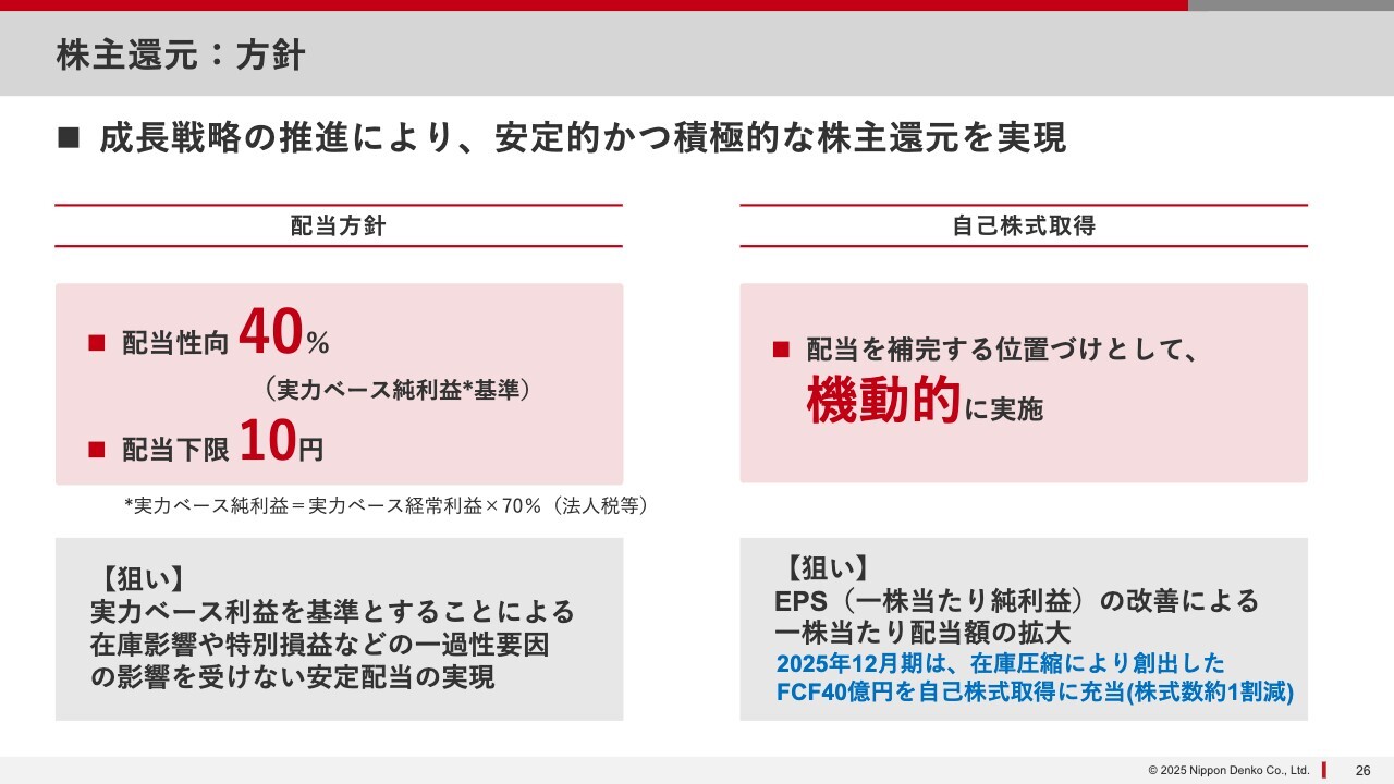 配当は、実力ベース純利益を基準とする配当性向40パーセント、配当下限を10円と設定しています。実力ベースというのは、在庫影響や特別損益など、一過性要因をすべて除いた利益です。