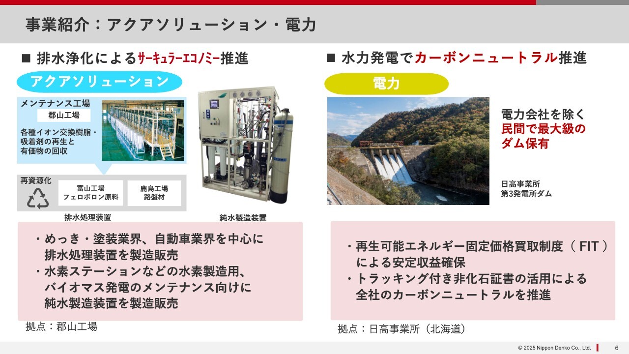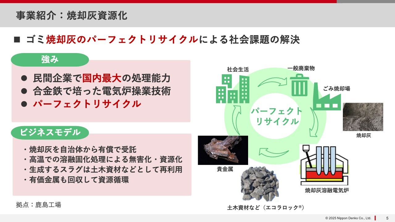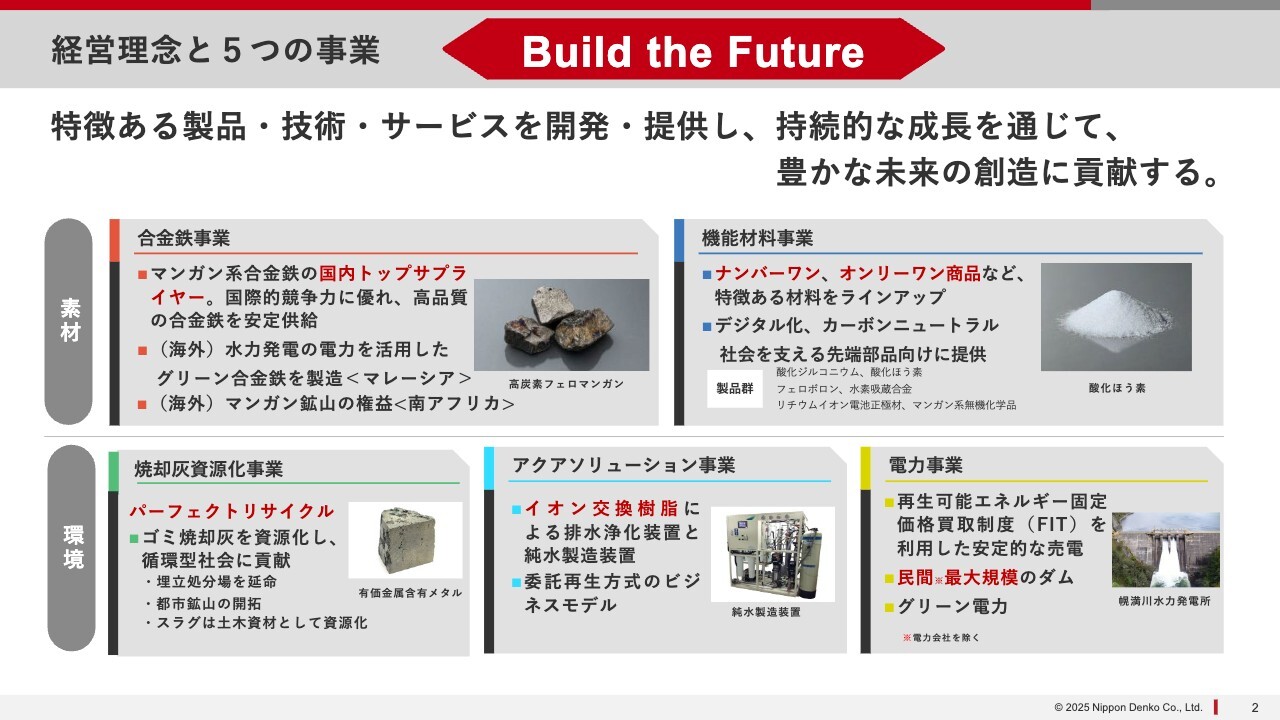 100年前から始めた合金鉄事業を中心に、その基本的な技術を使いながら、さまざまな高機能材料も作っています。後ほど一つひとつご説明しますが、そのような技術を使い、焼却灰資源化事業、アクアソリューション事業、電力事業も含め、「素材」と「環境」の2つの分野で5つの事業を展開している会社です。