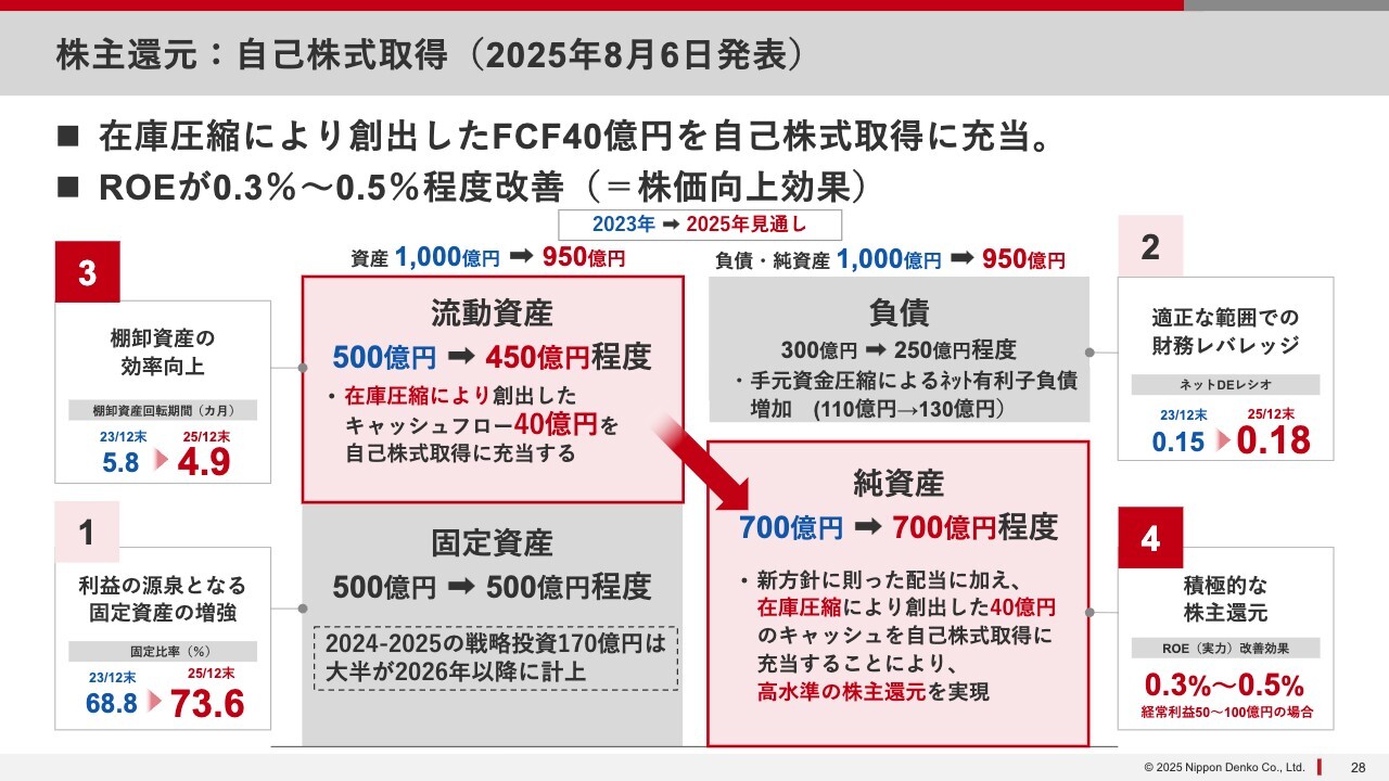 一方で流動資産については、在庫削減の取り組みにすでに着手しており、その成果により創出した40億円を自己株買いに充当しました。自己株買いの実現で資本の効率化が図られ、ROEが0.3パーセントから0.5パーセント改善したと考えています。