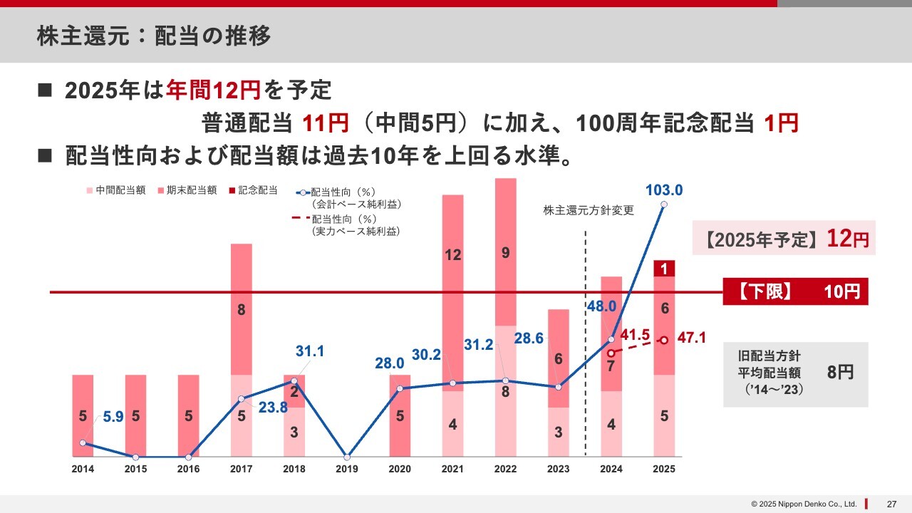 配当については、先ほどお伝えした配当性向40パーセント、下限10円の方針に基づき、2025年は普通配当11円に創業100周年記念配当1円を加え、年間12円と公表しています。