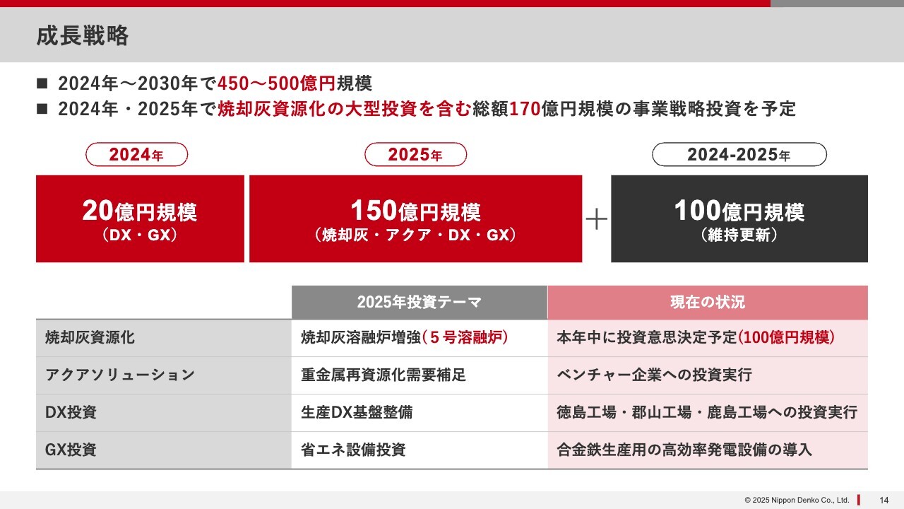 4つのターゲットについて、一つひとつ見ていきます。まず、成長戦略です。「2030年までに450億円から500億円を投資する」とお伝えしましたが、昨年から今年にかけて、すでに170億円の投資を考えています。その中の一番大きなものが焼却灰資源化のための能力増強で、こちらに100億円を投資する計画です。