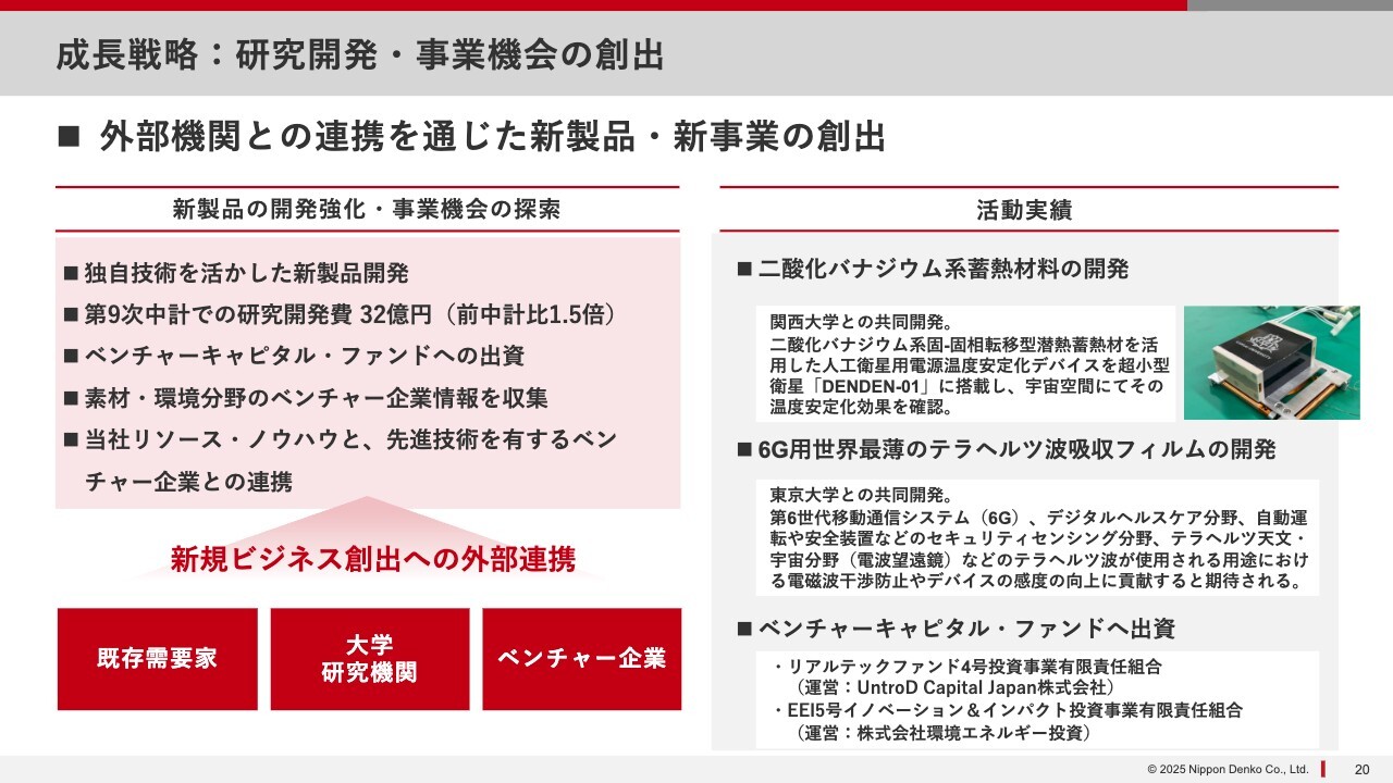 スライド右側に、最近発表した例を記載しています。まず、関西大学との共同開発による二酸化バナジウム系蓄熱材料の開発ですが、こちらは宇宙衛星に使われる材料です。また、東京大学との共同開発で、6G用のいろいろな妨害電波のようなものを遮断する素材を開発し、市場に投入しようとしているところです。