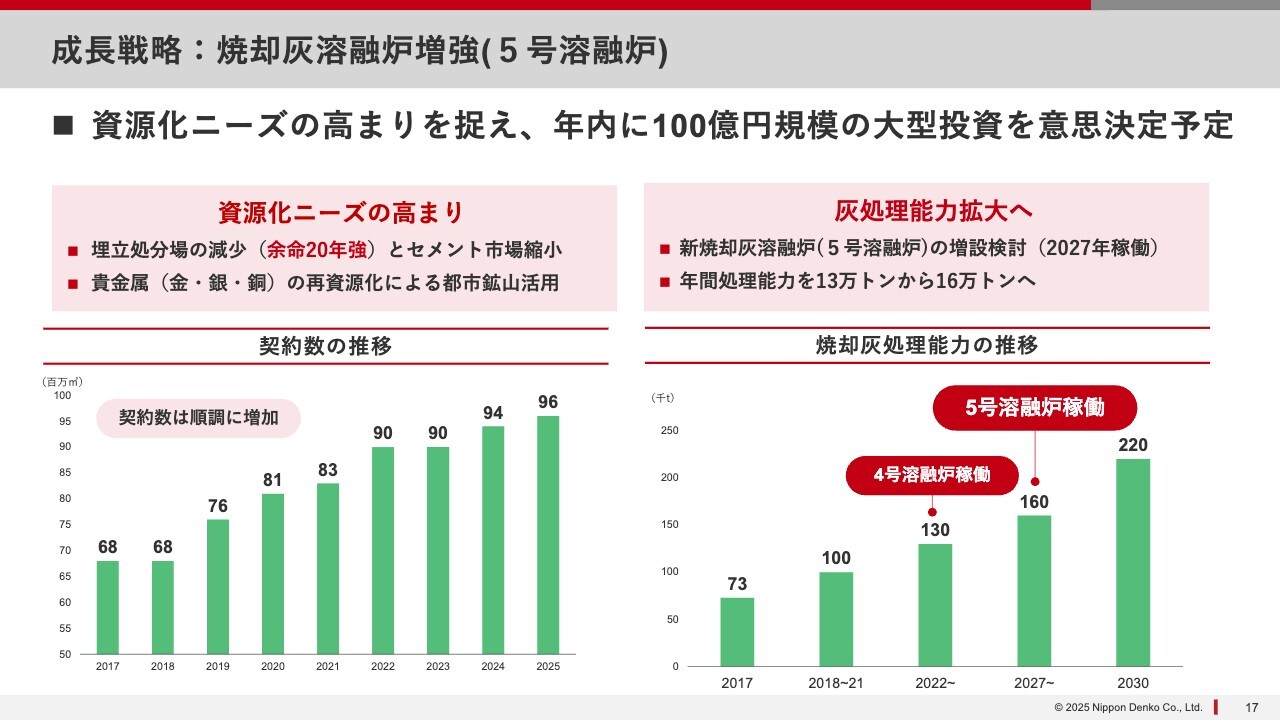 契約数を増やしていくことにより、私どもが持っている溶融炉の能力が足りなくなります。それを補うために、2027年に100億円をかけて新しい溶融炉を作る計画を今、まさしく実行に移していこうという段階に来ています。