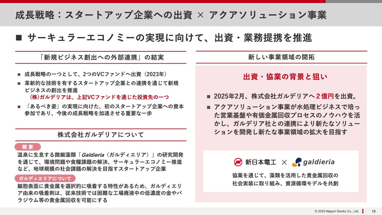 他にもいろいろな成長戦略として、アクアソリューション事業という排水浄化のビジネスの延長線上で、工場の排水の中に入っているパラジウムや金を取るためのビジネスを拡大していきます。そのため、ベンチャー企業のガルデリアという会社への出資・業務提携を推進しています。
