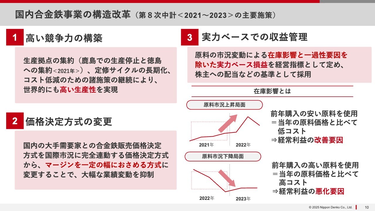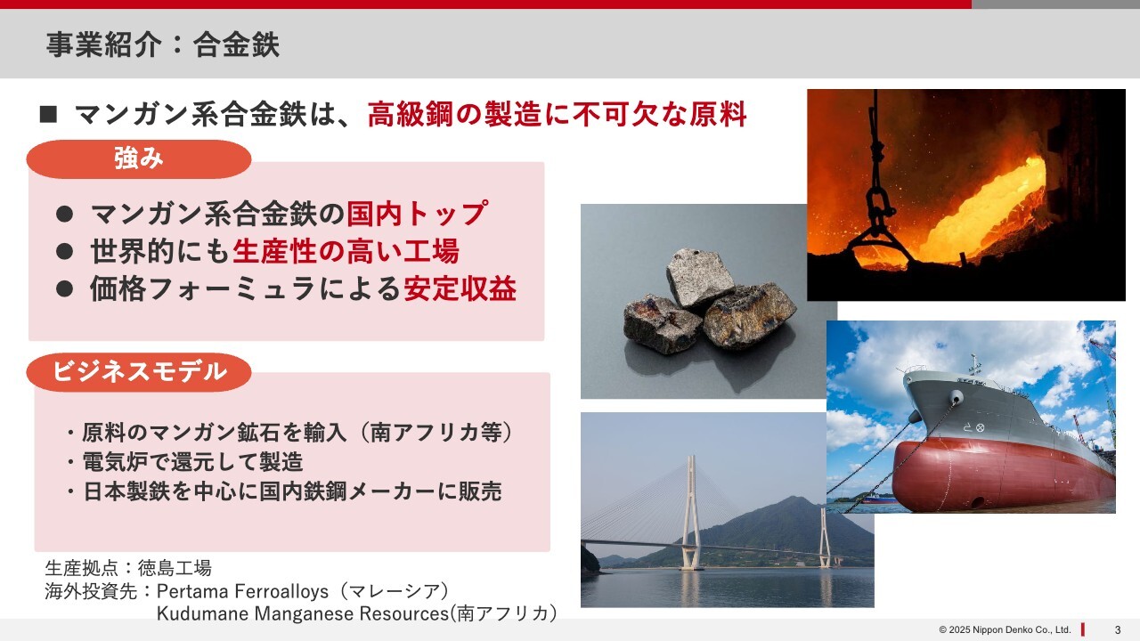 合金鉄事業は、当社にとっては非常に大きなポーションがあります。一方で、後ほどご紹介しますが、非常に市況に左右されやすく、市況が変わると収益も大きく変わってしまうというコントロールしにくいビジネスでしたので、直近の構造改革によってその点をマネージしました。