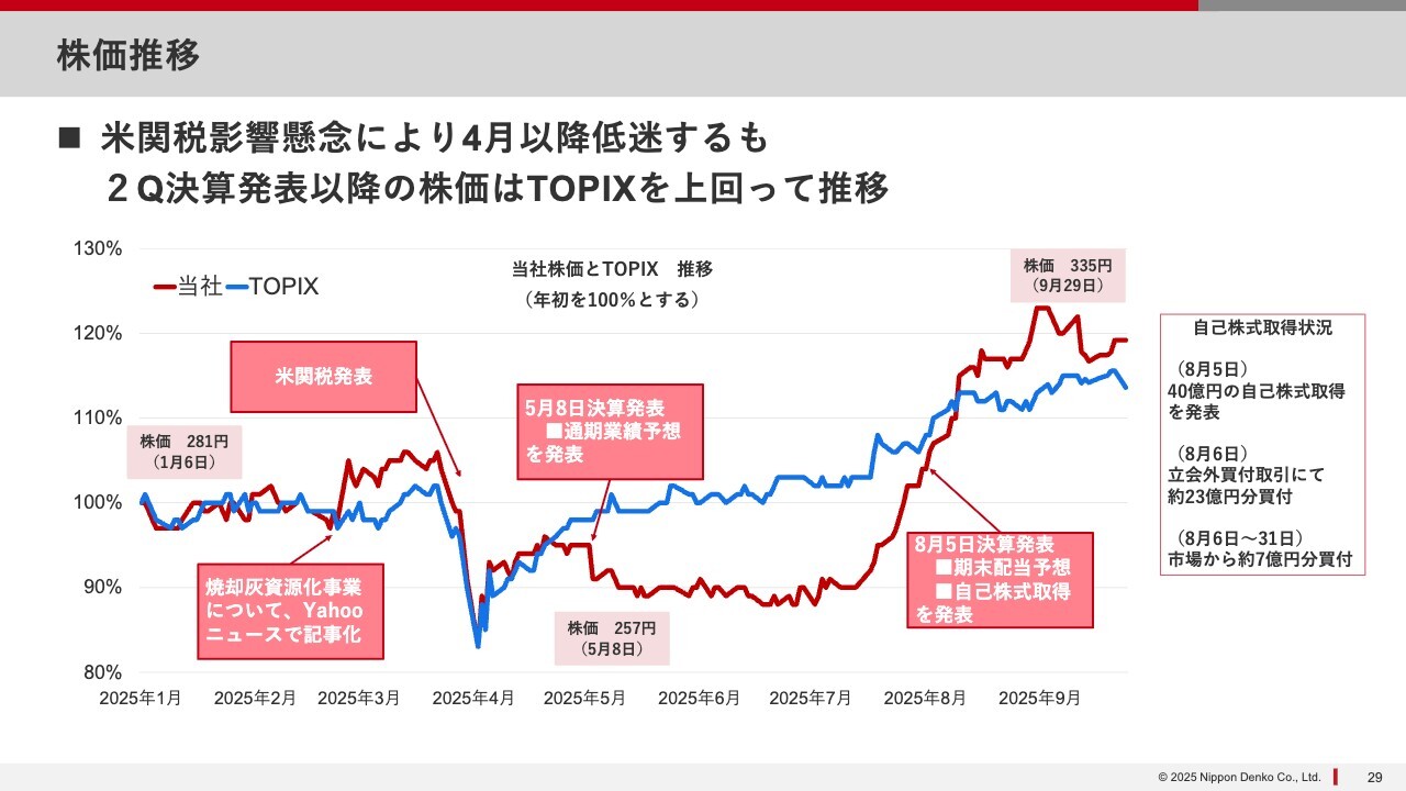 そのようなことを今年8月の第2四半期決算説明会で発表したおかげか、今年はアメリカのトランプ関税導入による株価の低迷が長く続いた中、足元では株価はかなり良いところで推移しています。