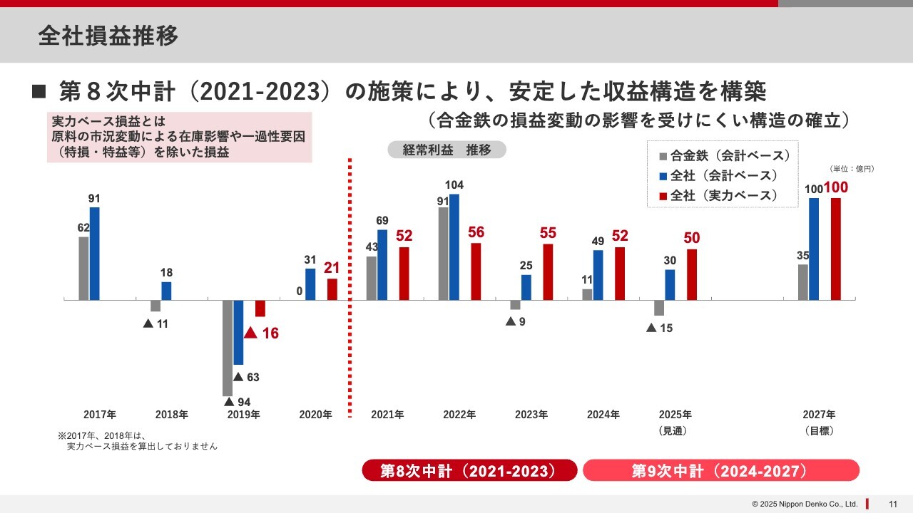 スライド右側のグラフは、これまでの売上高や利益の推移です。実力ベースの経常利益は約50億円レベルです。内訳をご覧いただくと、棒グラフの下部に示している合金鉄事業以外の事業の合計は、2023年の32億円から今年は45億円と着実に増えています。