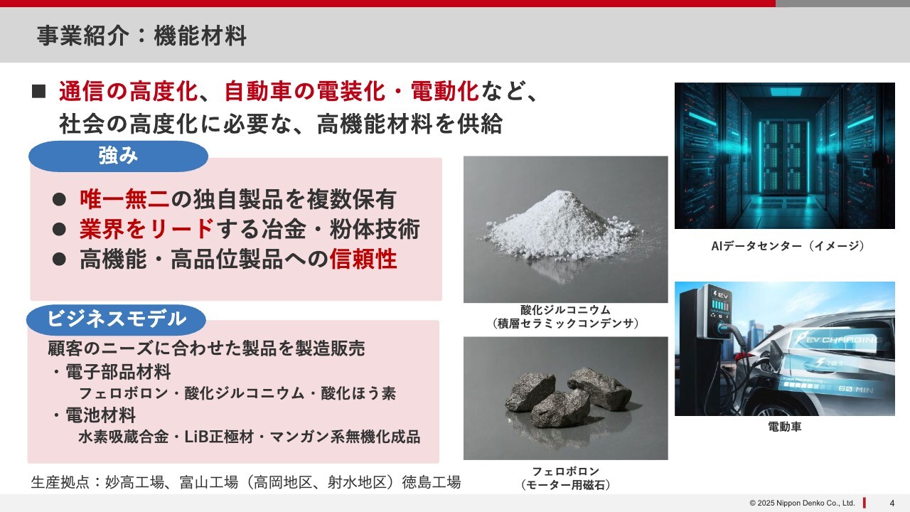 機能材料事業です。この事業では、例えば5Gや6Gといった通信の高度化、あるいは電気自動車など、いろいろなところで電動化が進んでいる自動車分野で使われる、非常に機能の優れた材料を全般的に供給しています。