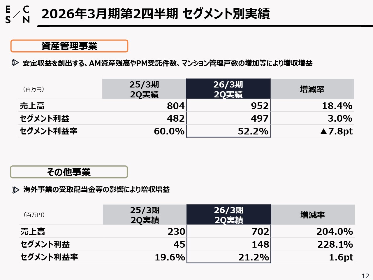 新中期経営計画から次なる中期経営計画に向けて、成長エンジンとして注力していきたいのが資産管理事業です。資産管理事業の売上高は上半期で9億5,200万円、セグメント利益は4億9,700万円と、前年同期比で増収増益となりました。
