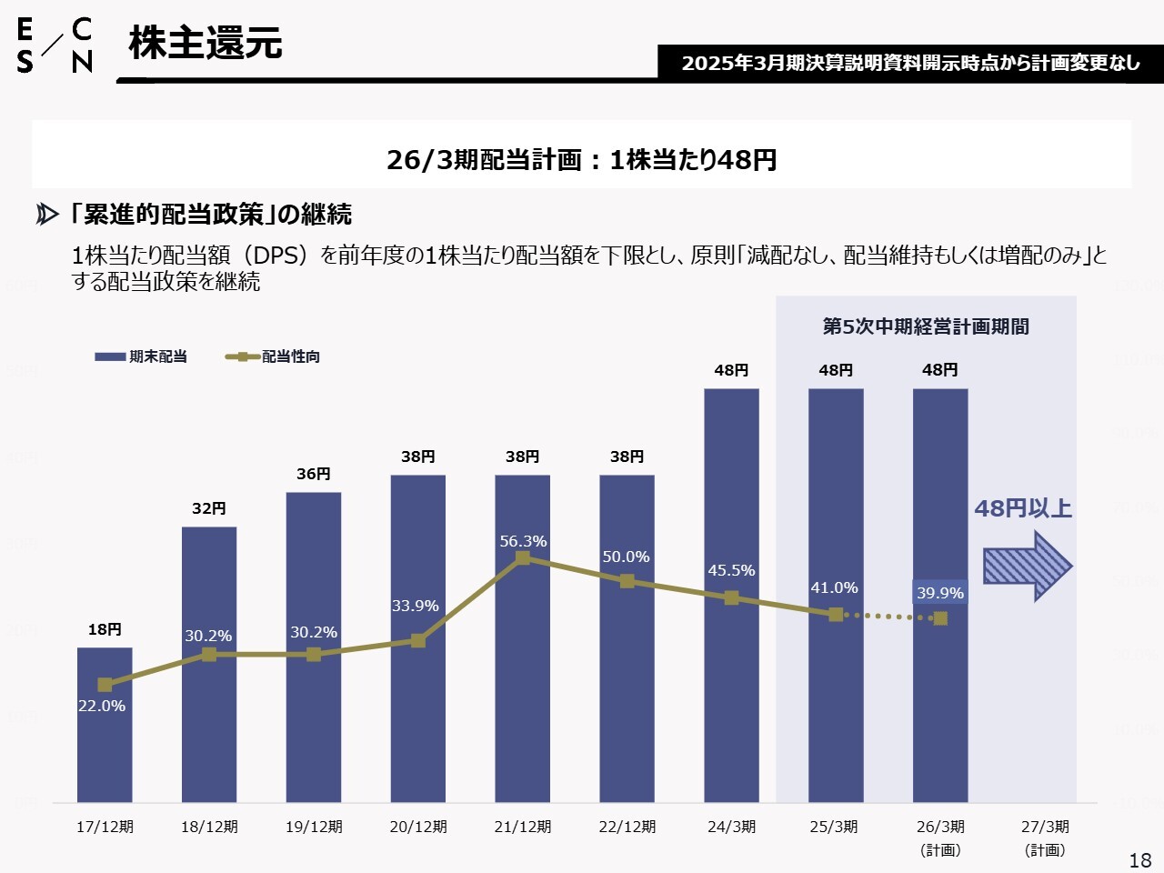 株主還元政策です。「累進的配当政策」の継続を掲げ、減配しないことを株主のみなさまにコミットし、前期は1株当たり48円の配当を実現しました。今期も48円以上の配当を実現したいと考えています。