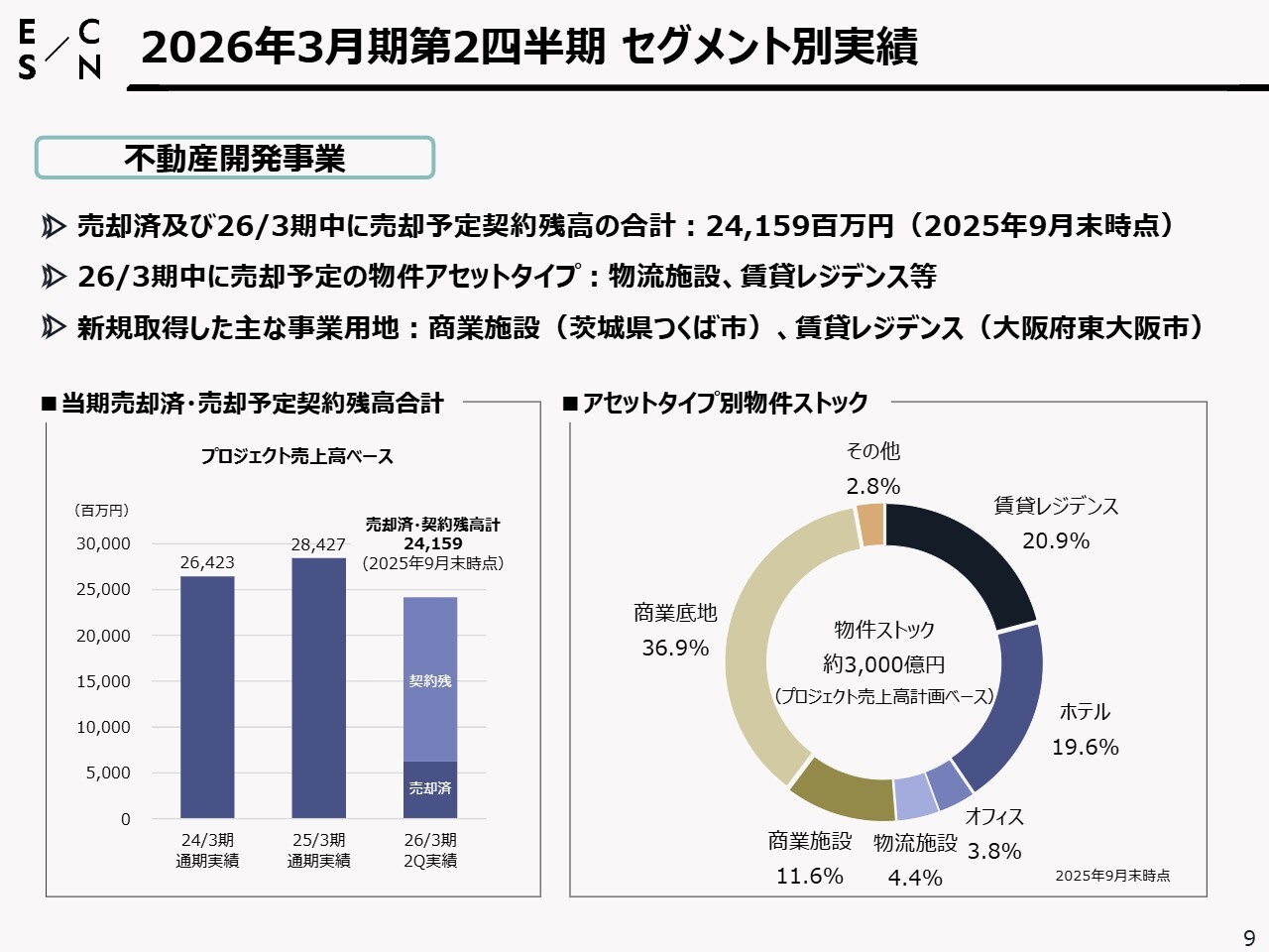 スライド下段の円グラフをご覧いただくと、不動産開発事業として現在約3,000億円の物件ストックが積み上がっていることがわかります。先ほどの住宅分譲事業とあわせて、7,000億円規模の仕入れが実現できており、来期以降の持続的な成長を実現するためのアセットとして、仕入れが堅調に推移していることがご確認いただけると思います。