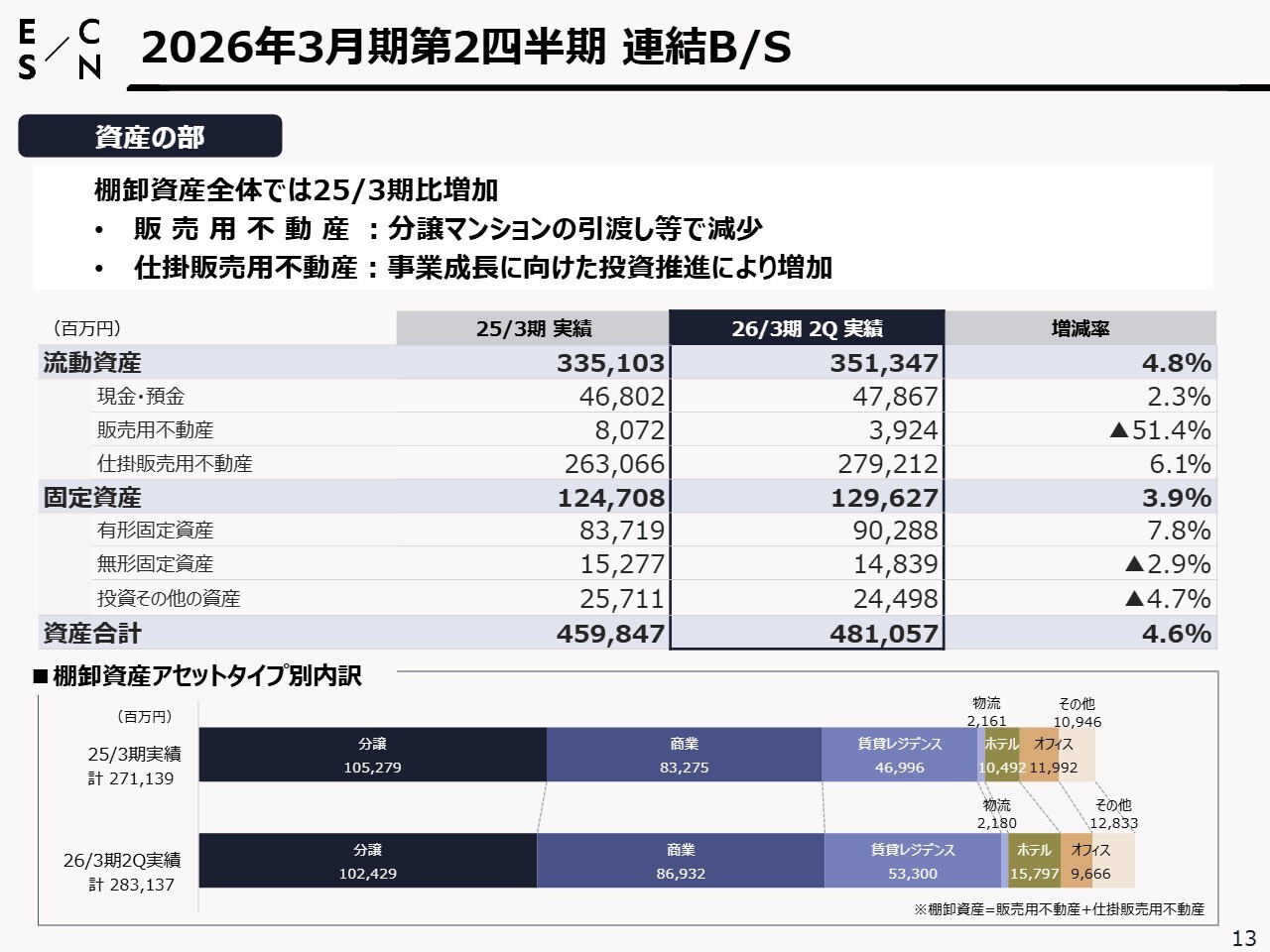 スライド下段に、棚卸資産のアセットタイプ別内訳を記載しています。分譲が約1,000億円まで積み上がっており、加えて商業、賃貸レジデンスが主要なアセットタイプとなっています。ホテルも第2四半期で積み上がってきているところです。