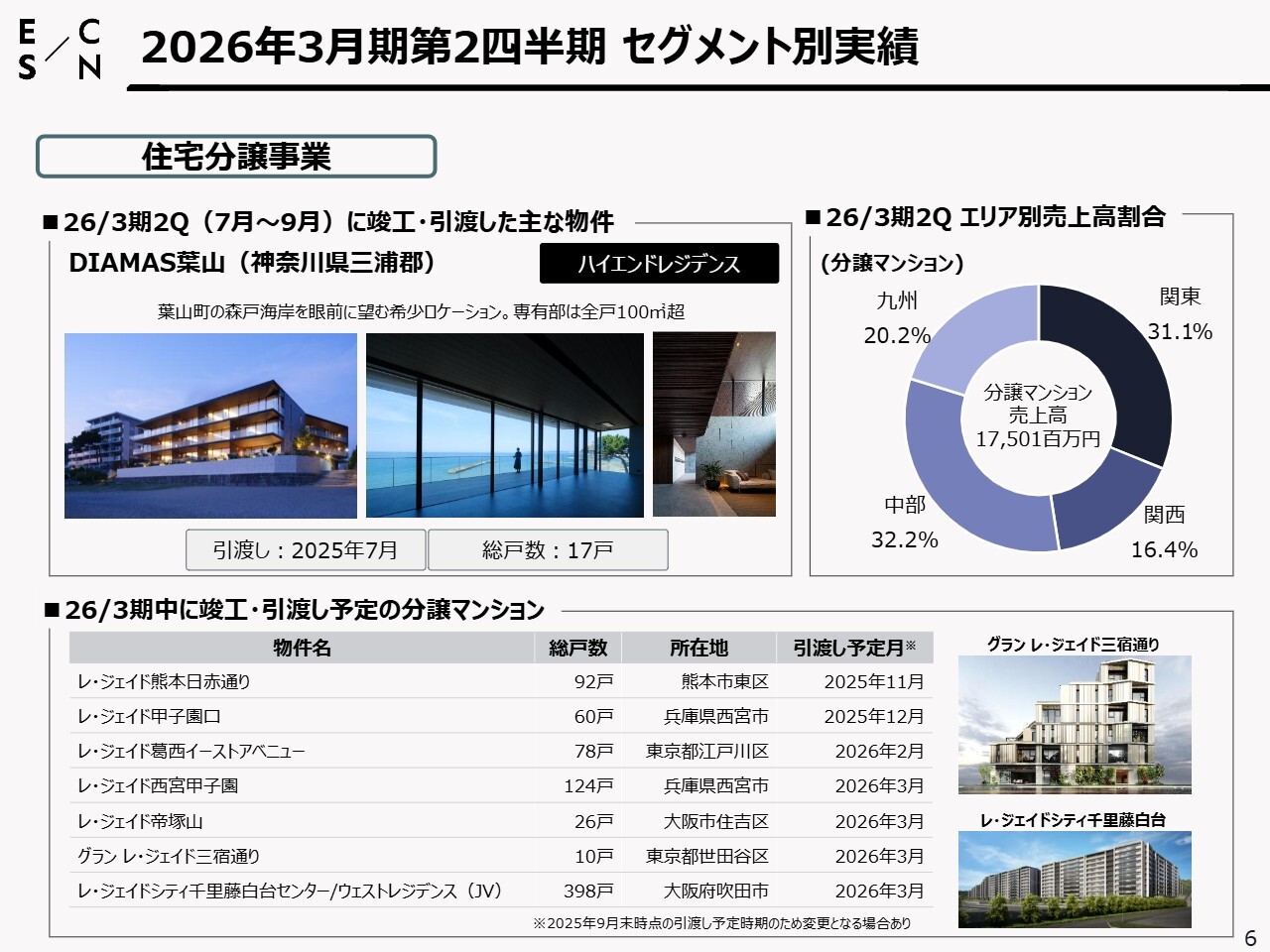 また、来年以降は北海道のプロジェクトの引渡しが予定されており、さらに5つの拠点でバランスの取れた分譲事業を展開できると考えています。