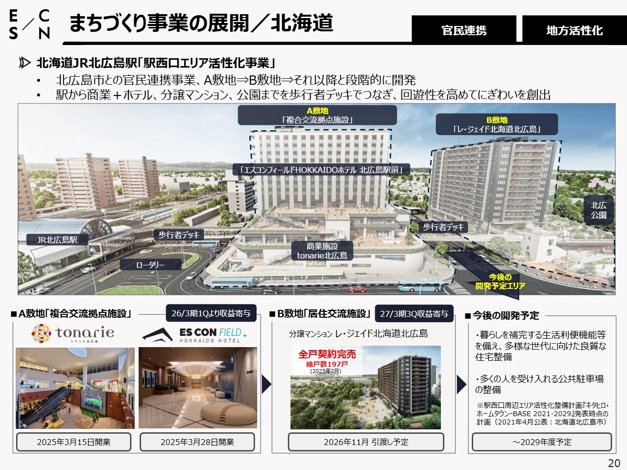 まず、まちづくり事業の展開についてです。我々が現在非常に注力している北海道北広島市のJR北広島駅「駅西口エリア活性化事業」により、「エスコンフィールドHOKKAIDO」を核としたまちづくりがさらに加速して進行しています。