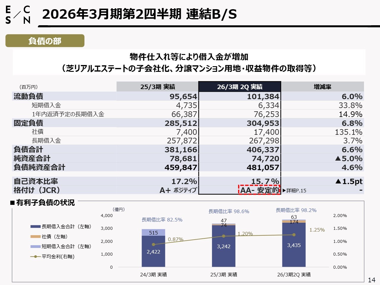 負債の部です。物件の仕入れが増加しているため、借入金も増加しています。自己資本比率は15.7パーセントと、前期末と比較して1.5ポイント低下していますが、期末時点では17パーセントから18パーセントでの着地を想定して進めています。