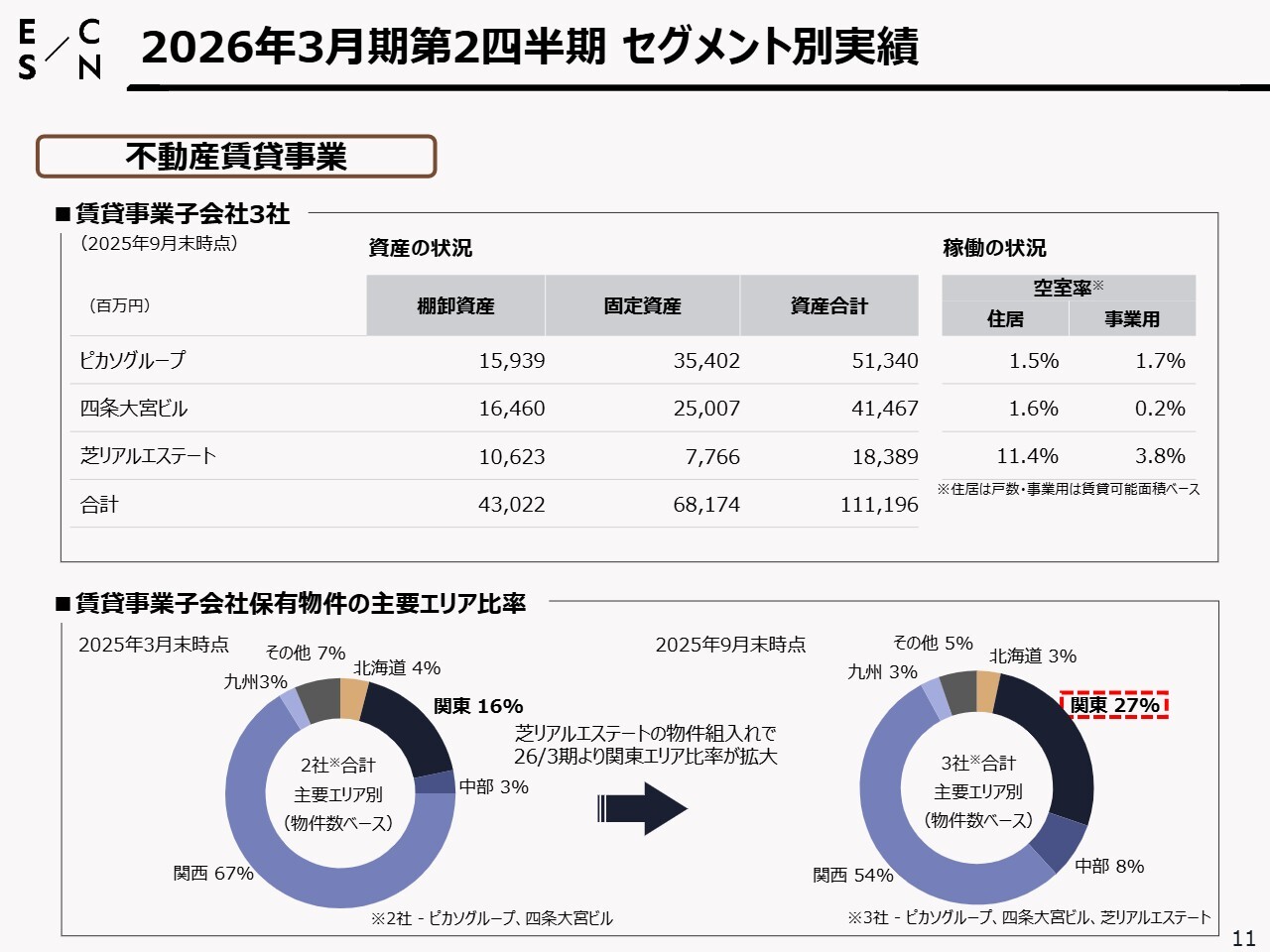 スライド下段には、賃貸事業子会社が保有する物件の主要エリア比率を示しています。ピカソグループは関西が中心で、四条大宮ビルも関西の京都を中心としていますが、今回芝リアルエステートの物件が組み入れられたことで、関東圏の比率が高まっています。