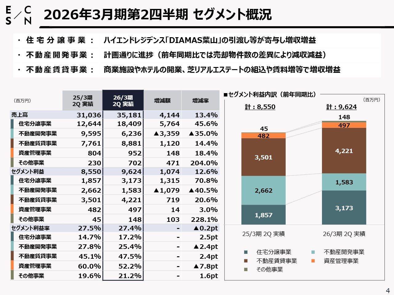 セグメントの概況をご説明します。住宅分譲事業は、神奈川県三浦郡葉山町においてハイエンドレジデンス「DIAMAS葉山」の引渡しなどが寄与し、増収増益となりました。